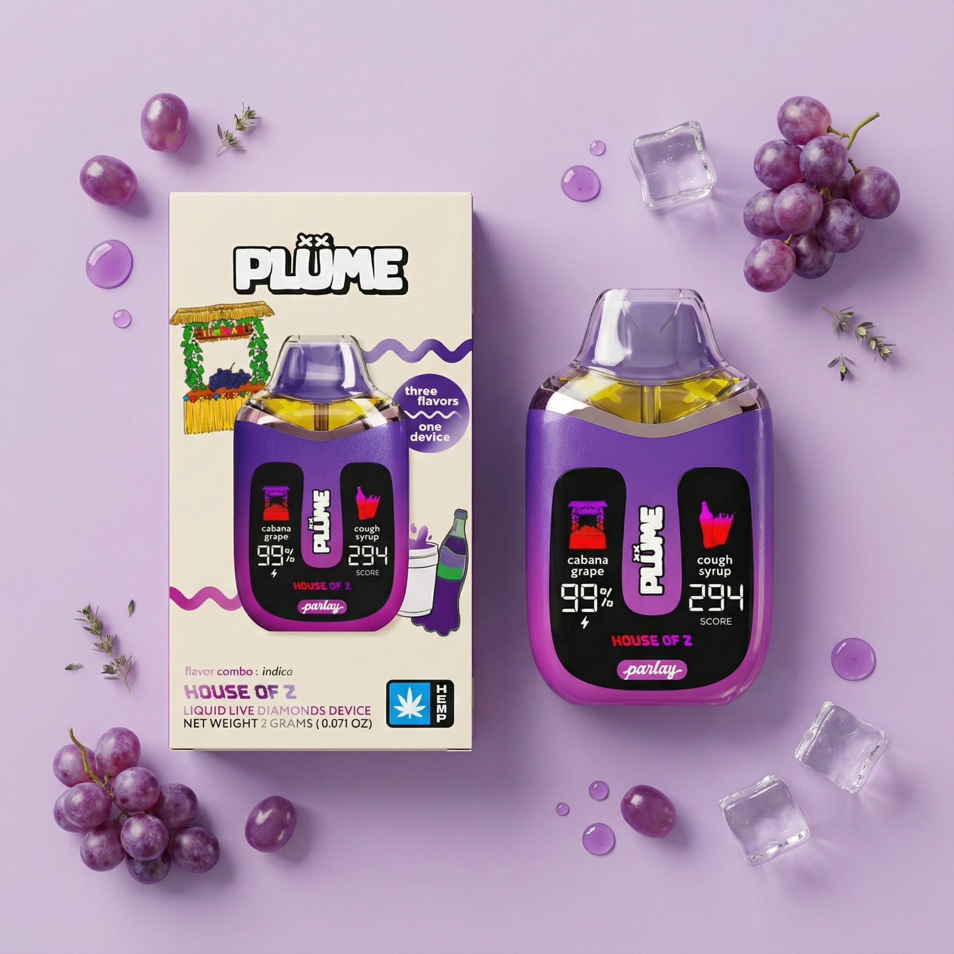 Unlock rich, deep flavor and full-body relaxation with the Plume Parlay 2g Liquid Live Diamonds Blend Vape in the bold House of Z indica blend. This premium all-in-one device features three distinct flavor profiles in one sleek unit: Cabana Grape, Cough Syrup, and their combined fusion, House of Z. Designed with proprietary terpene formulas and advanced atomization technology, the Parlay delivers consistent vapor, powerful effects, and unmatched taste in every pull.