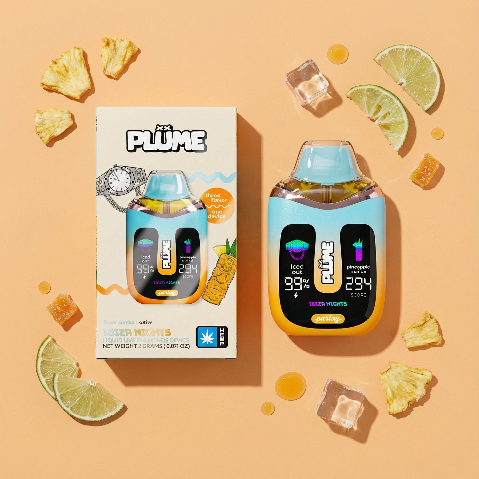 Turn up the tempo and ride the rhythm of flavor with the Plume Parlay 2g Liquid Live Diamonds Blend Vape in Ibiza Nights, a vibrant sativa blend inspired by tropical cocktails and ocean breezes. Featuring the mouthwatering strains Iced Out and Pineapple Mai Tai, this three-in-one device delivers each strain individually, along with a custom fusion that captures the full party vibe in one unforgettable experience.
