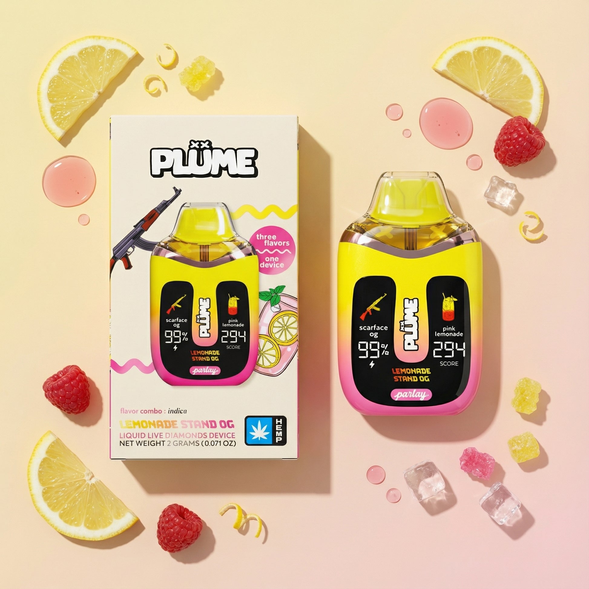 Step into a refreshing, flavor-forward experience with the Plume Parlay 2g Liquid Live Diamonds Blend Vape in the bold and calming Lemonade Stand OG indica blend. This unique all-in-one device delivers not one, but three flavor experiences in a single unit: Scarface OG, Pink Lemonade, and their combined fusion, Lemonade Stand OG. Designed with natural terpenes and advanced atomization technology, this device offers potent effects with smooth, curated flavor combinations that redefine what a disposable can be.