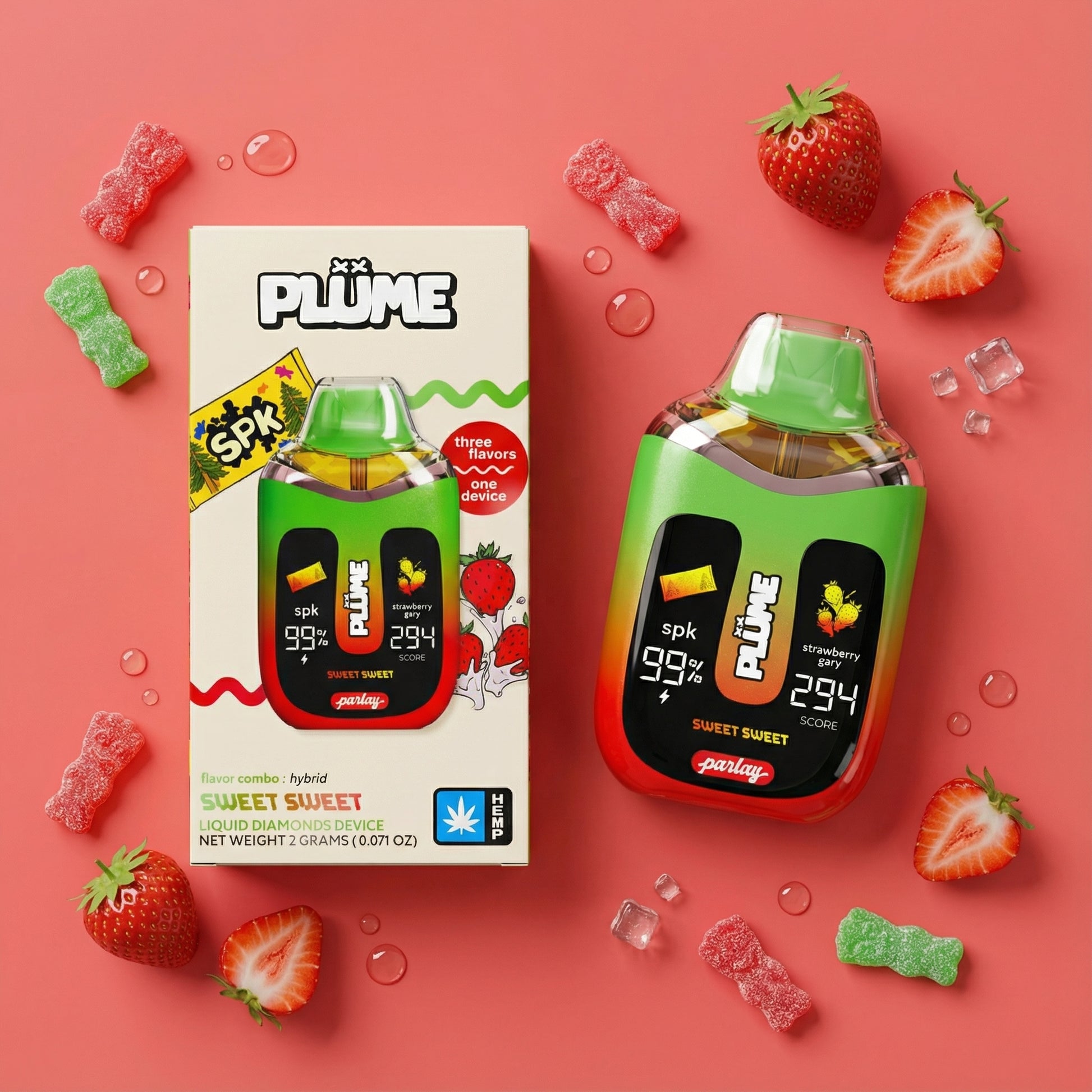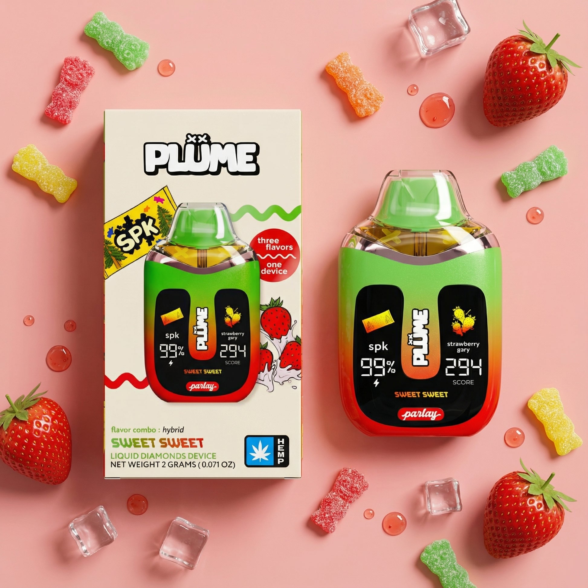 Double down on bold flavor and balanced effects with the Plume Parlay 2g Liquid Live Diamonds Blend Vape in the vibrant and juicy Sweet Sweet hybrid blend. This all-in-one disposable vape features a triple flavor lineup in one sleek device: SPK, Strawberry Gary, and their combined fusion, Sweet Sweet. Designed with proprietary atomization technology and enriched with natural terpenes, this device delivers smooth, flavorful vapor and a well-rounded high for any time of day.