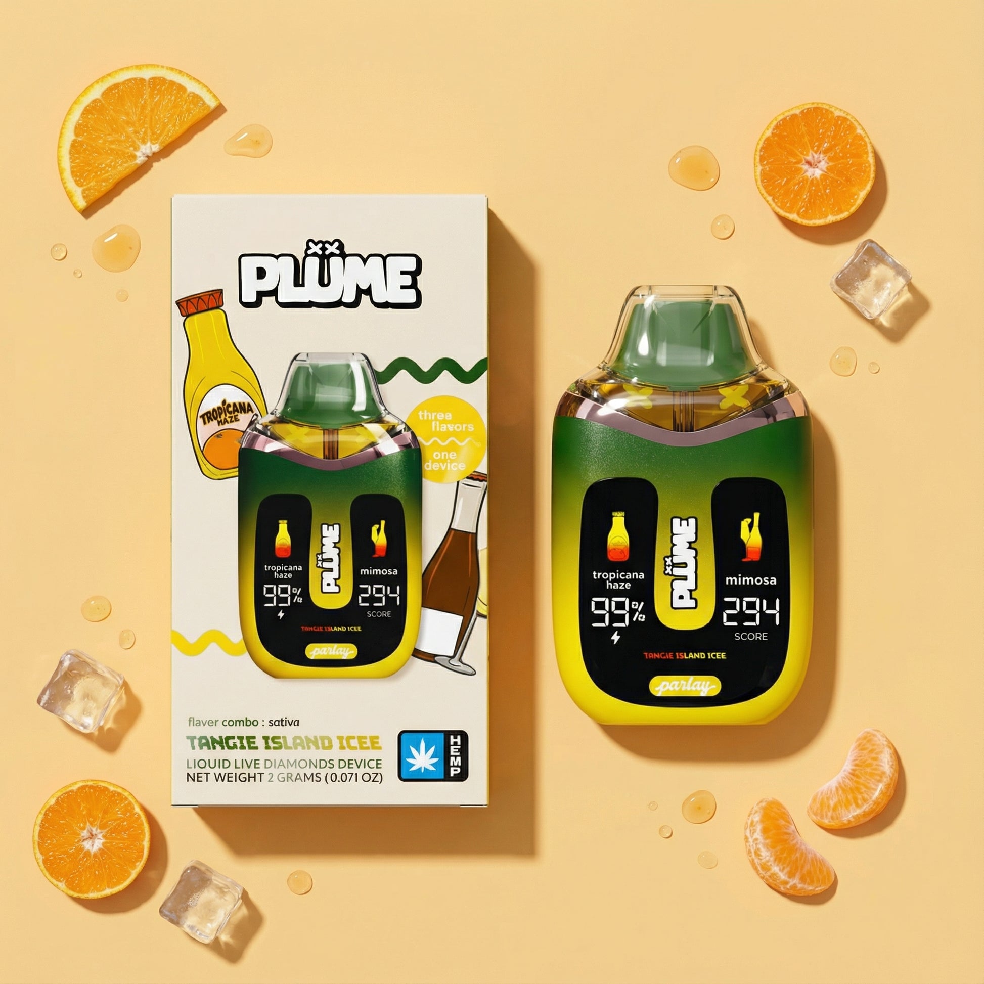 Step into citrus paradise with the Plume Parlay 2g Liquid Live Diamonds Blend Vape in the invigorating Tangie Island Icee sativa blend. This unique three-in-one device features two bright and juicy strains, Tropicana Haze and Mimosa, along with their combined flavor fusion, delivering a vibrant and refreshing terpene experience in every hit.
